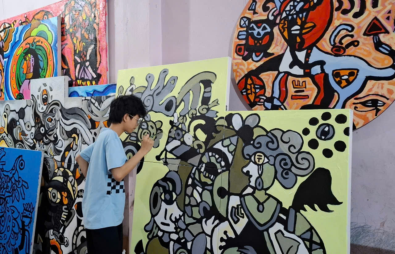 Hoàng Nhật Quang đang vẽ tranh chuẩn bị cho triển lãm cá nhân lần 2, tháng 6 năm 2025